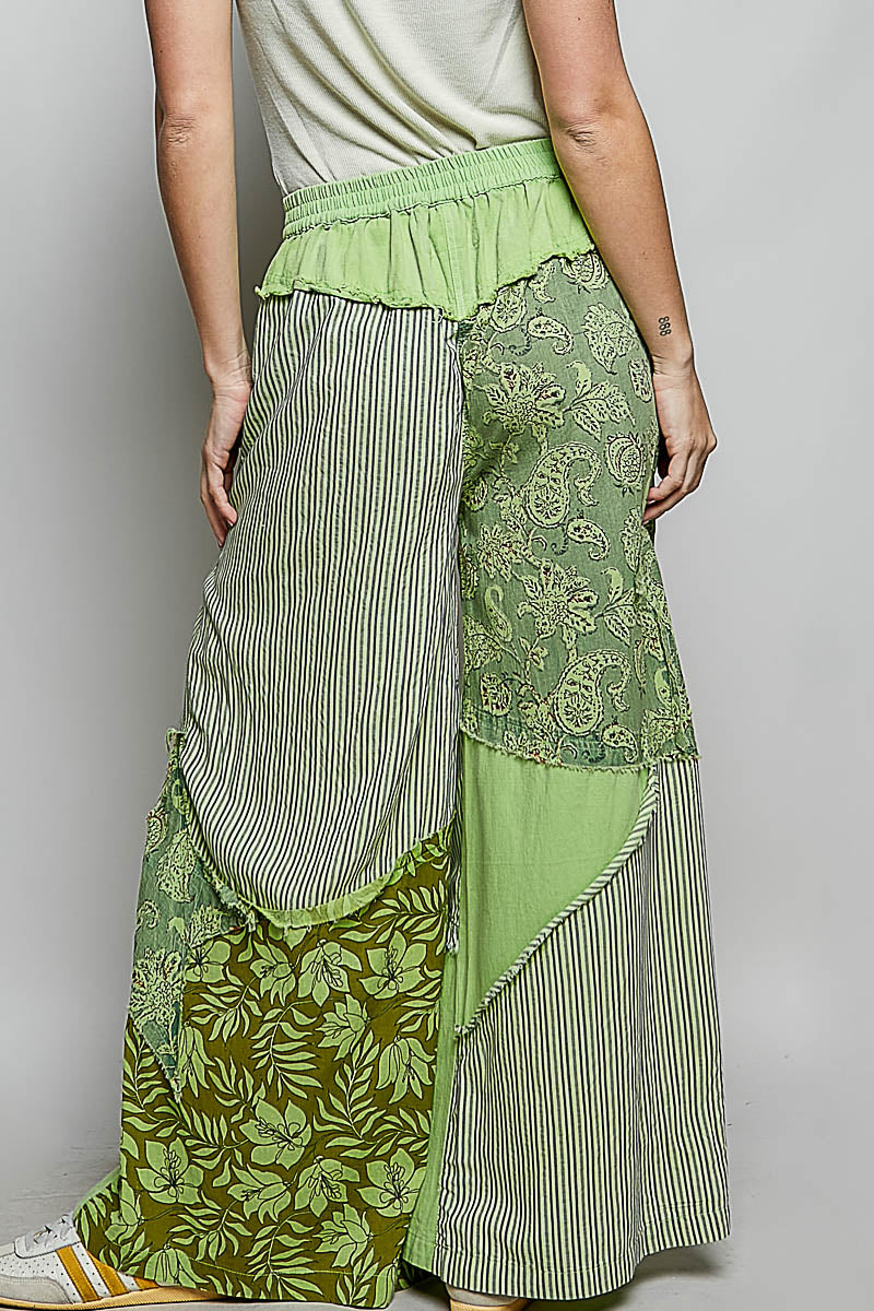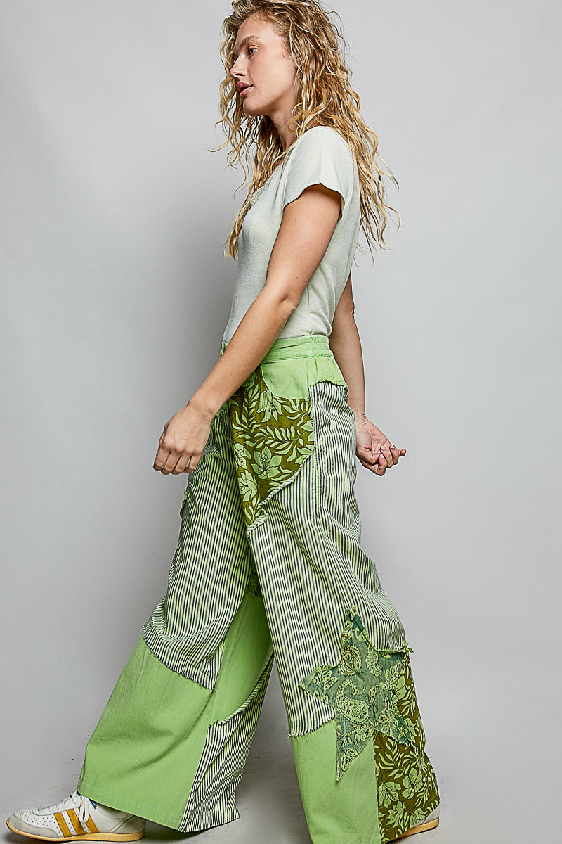 Wide-leg pants crafted from printed woven fabric, featuring varied patchwork construction and a side big star patch for a bold visual accent. Designed with a button closure and a partial elastic waistband at the back, this piece blends effortless comfort with a visually engaging, playful design.