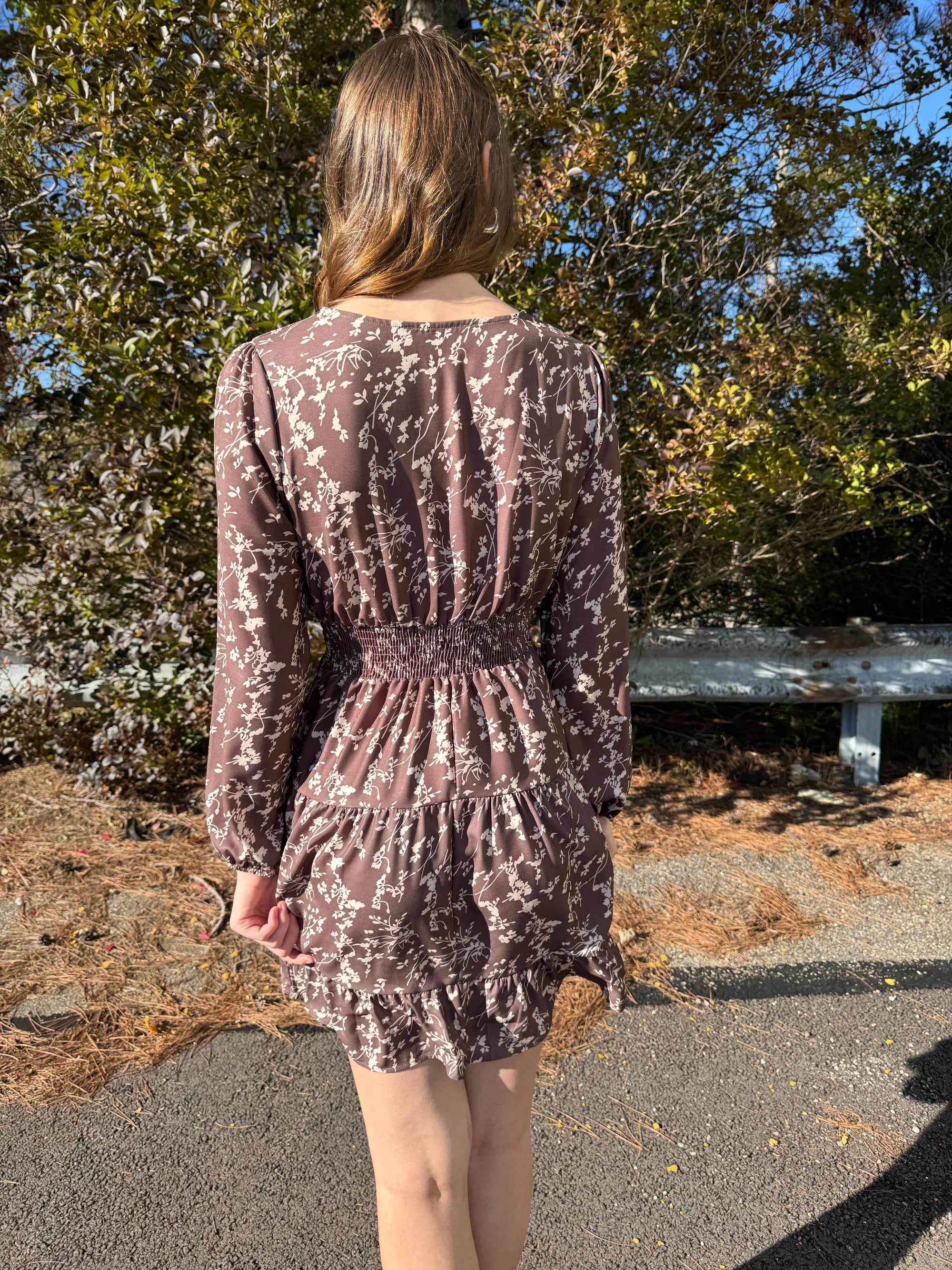 A Surplice Smocked Waist Tiered Long Sleeve Knee Length Floral Print Dress