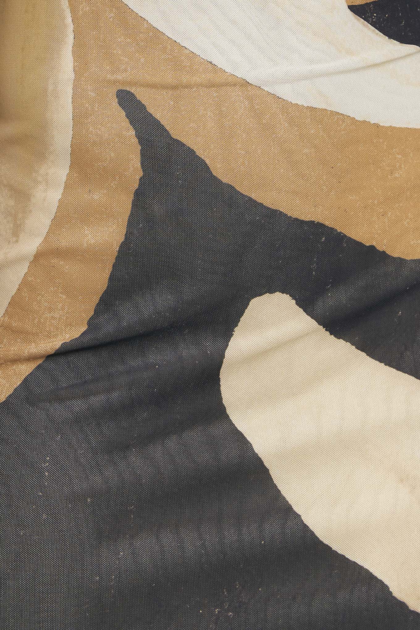 A printed power mesh midi dress featuring round neckline, long sleeve and back neck button closure