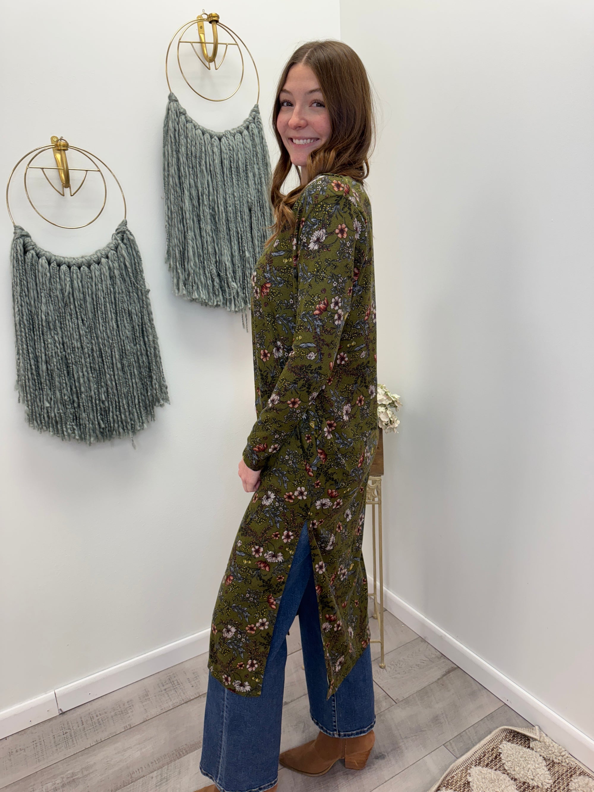 A Long Sleeve Floral Print Hacci Open Duster with Side Slits