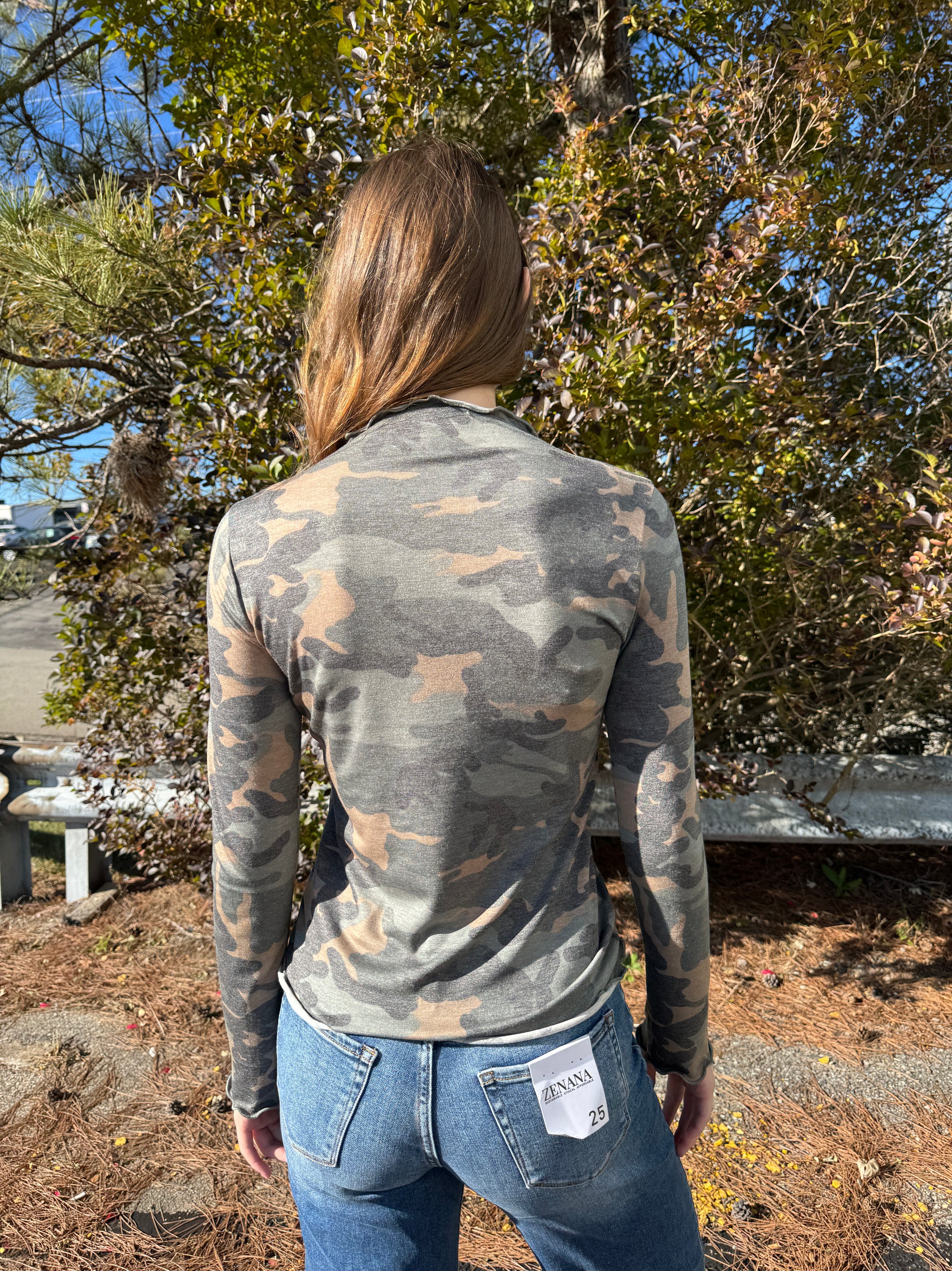 A Mock Long Sleeve Camo Print Top with Frilled Merrow Hem