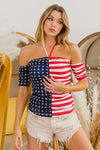 The American Flag Off-Shoulder Top with Front Ruched detailing is a stylish and patriotic piece that combines trendy off-shoulder design with a festive American flag motif. The front ruched detailing adds a flattering and feminine touch to the top, perfect for celebrating holidays like Independence Day in style. Pair this top with denim shorts or jeans for a chic and spirited look that showcases your love for the USA in a fashionable way. Perfect for adding a touch of Americana to your ensemble with a modern twist.