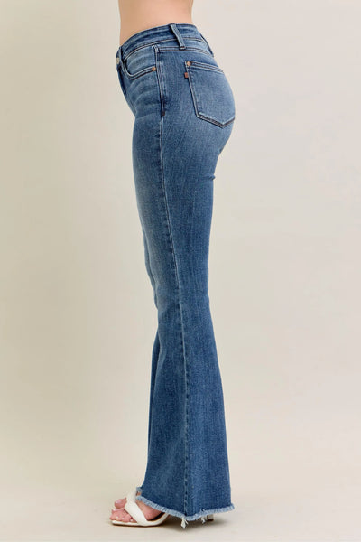 These premium flare jeans combine classic style with modern details. Crafted from high-quality stretch denim in a versatile medium wash, featuring a flattering high-rise waist and dramatic flared leg silhouette. The raw hem adds a contemporary edge while the traditional 5-pocket design maintains timeless appeal. The denim material offers comfortable stretch while maintaining shape throughout wear. Perfect for creating a lengthening silhouette, these jeans can be styled for both casual and semi-formal occasions. The balanced proportions and expert construction ensure lasting wear and consistent fit.
