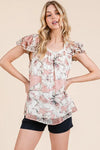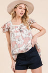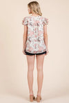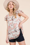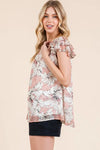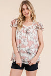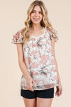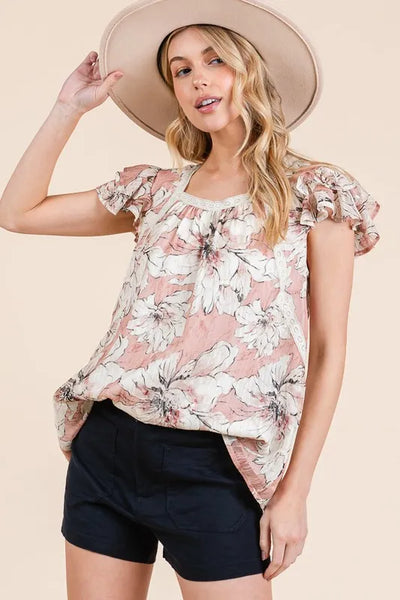 Embrace a romantic look with this floral print lace trim ruffle cap sleeve top. The floral print adds a touch of femininity and charm to the top. The delicate lace trim detailing brings a vintage and elegant feel. The ruffle cap sleeves give the top a whimsical and playful touch. Perfect for adding a romantic flair to your outfit with a hint of vintage chic.