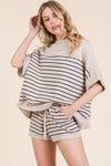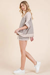 Stay stylish and comfortable in this matching set featuring a striped folded half sleeve top and shorts. The striped design adds a classic and chic touch to the ensemble. The folded half sleeves offer a casual yet polished look. The shorts provide ease of movement and a relaxed fit. Perfect for a casual day out or lounging at home. Embrace a coordinated and trendy style with this cute and versatile set.