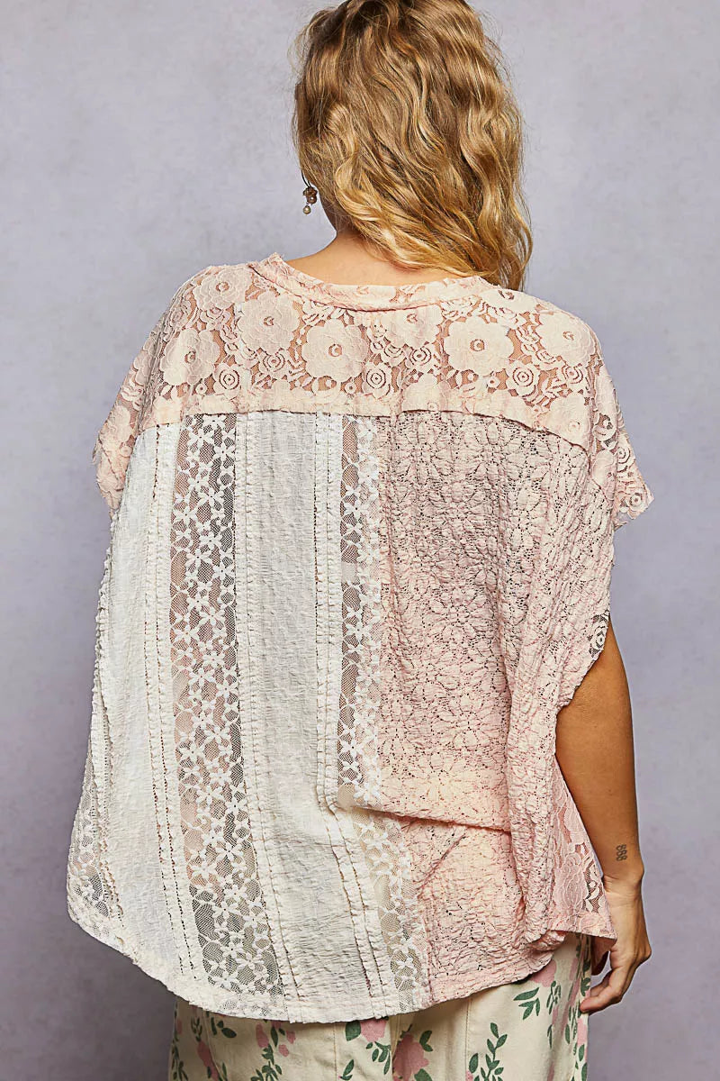 The V-neck sleeveless oversized fit top in lace is a chic and on-trend piece that embodies effortless style. Featuring raw edge detailing and a pointed solid pattern, this top offers a unique and modern touch to your look. The sleeveless design adds a touch of sophistication, perfect for warmer weather or layered with a jacket. Embrace the oversized fit for a relaxed yet stylish silhouette that can be dressed up or down. Elevate your wardrobe with this standout lace top that combines comfort and fashion-forward design.