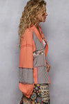 This striking coral patchwork jacket features a bold mix of patterns including stripes and graphic prints in contrasting black and coral tones. The oversized boyfriend-style fit offers comfortable wear while making a fashion statement. Constructed with quality materials and detailed with snap-button closures, this jacket showcases contemporary streetwear design with its unique patchwork panels and asymmetrical pattern placement. Perfect for layering over casual outfits, it combines comfort with edgy urban style. The relaxed silhouette and statement sleeves make it an ideal piece for those seeking distinctive outerwear that stands out from conventional jackets.