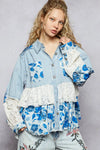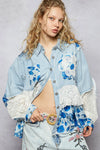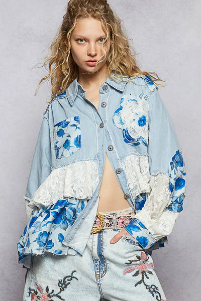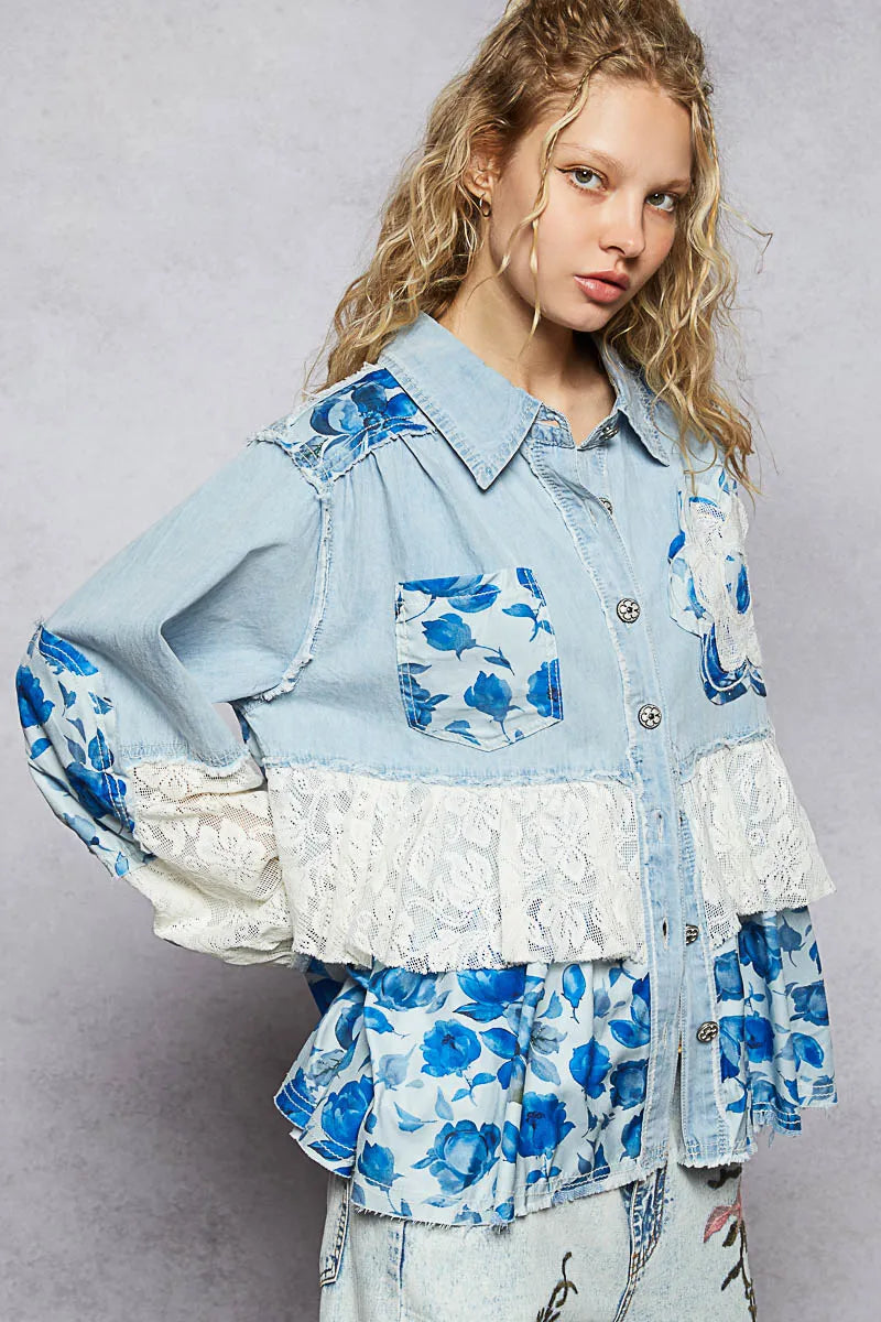 This stylish denim top features a unique patchwork design combining light blue denim base with vibrant blue floral print panels. The garment is enhanced with delicate white lace trim detailing that adds feminine touch to the casual denim construction. Made from premium cotton denim blend fabric, this button-up shirt offers comfortable oversized fit perfect for layering. The artistic mixed-media approach creates a distinctive bohemian aesthetic, while the classic collar and long sleeves maintain versatility for various styling options. Ideal for fashion-forward individuals seeking statement pieces that blend casual comfort with artistic flair.