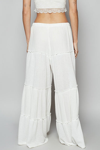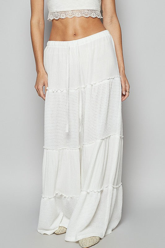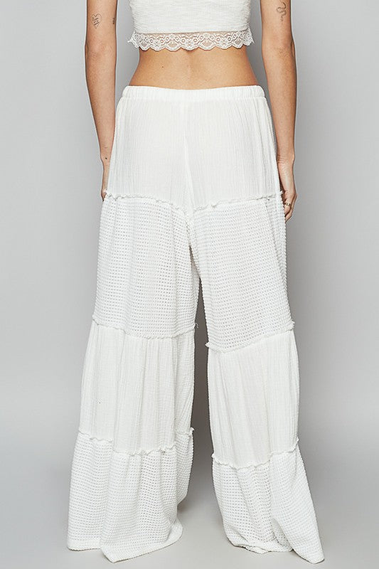 The Waffle-Knit Drawstring Wide Leg Pants feature a textured waffle-knit fabric with a unique honeycomb pattern. These pants are designed with a drawstring waist for adjustable fit and wide legs for a relaxed silhouette. Perfect for casual wear, they offer both comfort and style. Pair them with a basic tee and sneakers for a laid-back chic look.