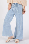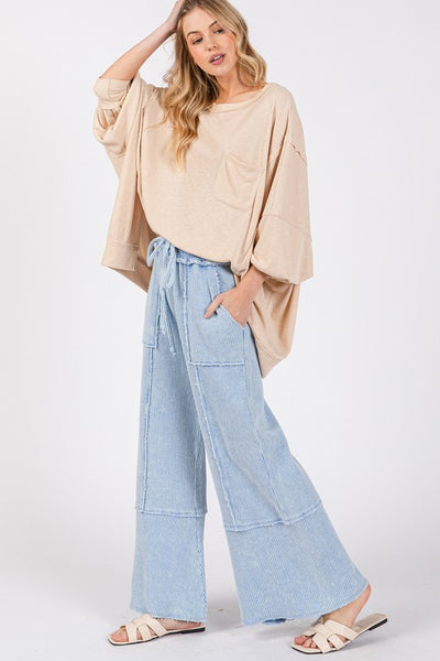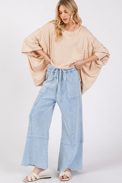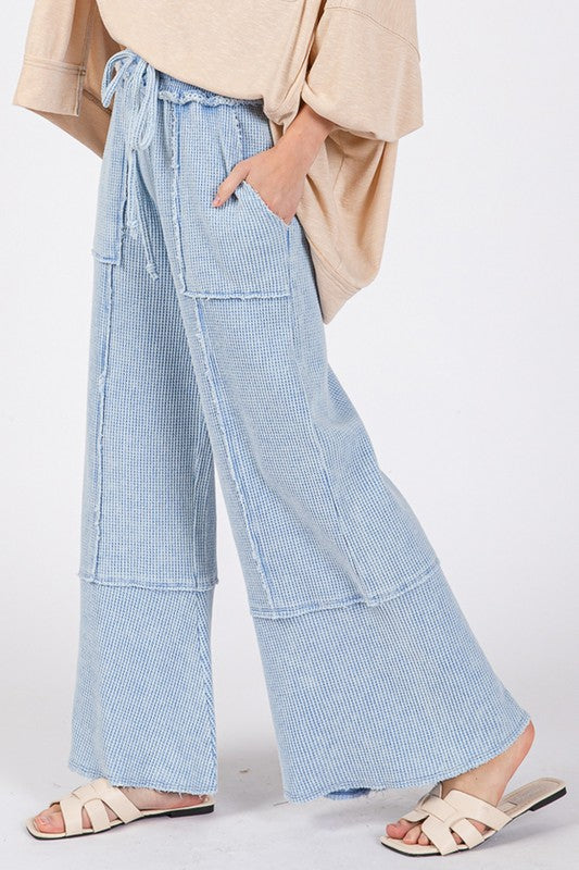 These Waffle Textured Wide Leg Mineral Washed Pants offer a unique blend of texture and style. The mineral wash gives them a subtle, worn-in look for a laid-back vibe. With a wide-leg silhouette, these pants are perfect for creating a casual and effortlessly chic outfit.