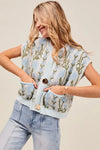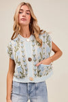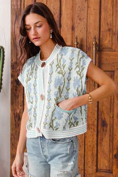 This button-front sweater vest features a charming mix of floral and stripe patterns, creating a unique and stylish look. The knitted construction provides warmth and comfort, making it a versatile layering piece for any season. With its trendy design and cozy feel, this sweater vest is sure to add a playful touch to your wardrobe. Pair it with your favorite top and bottoms for a fun and fashionable outfit.