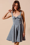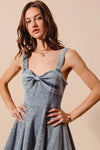 This mineral washed denim flare dress is a standout piece with a unique bow ribbon detail. The mineral wash adds a vintage touch to the stylish design. The flare silhouette enhances the feminine charm of this versatile dress. Make a statement in this trendy denim dress with a sweet bow ribbon accent.