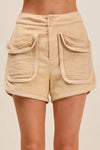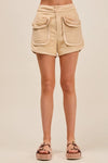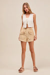 These stylish cargo shorts feature a high-waisted design with multiple functional pockets for both fashion and utility. Made from comfortable cotton blend fabric in a versatile beige tone, they offer a relaxed fit perfect for casual summer styling. The cargo pocket details add a fashion utilitarian touch while the high-rise cut creates a flattering silhouette. Ideal for pairing with crop tops, tank tops, or fitted tees for an effortlessly chic look.