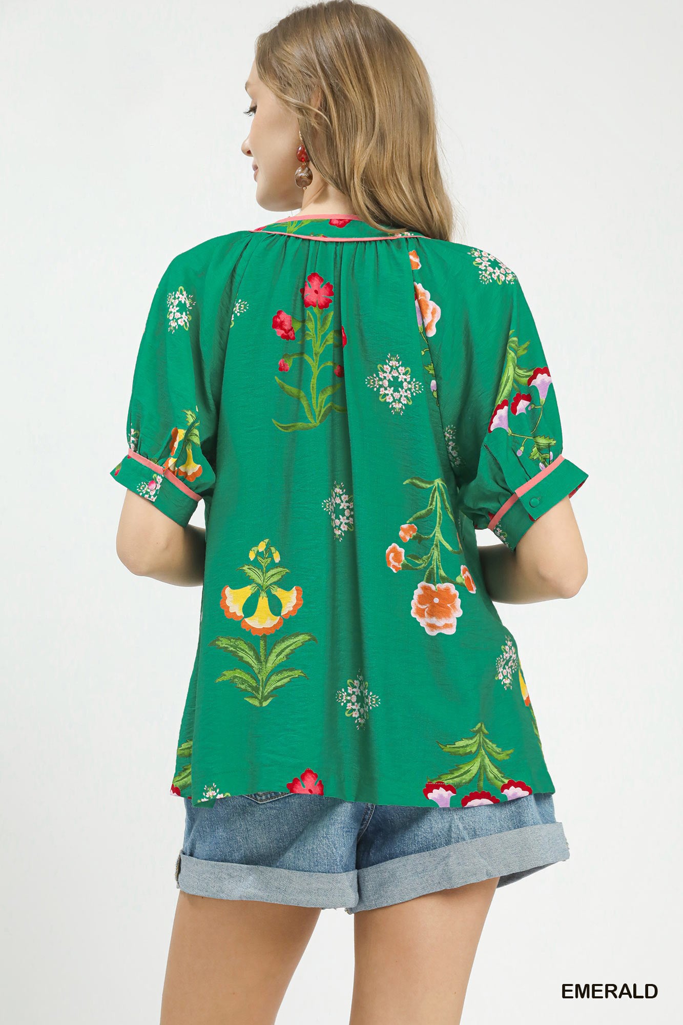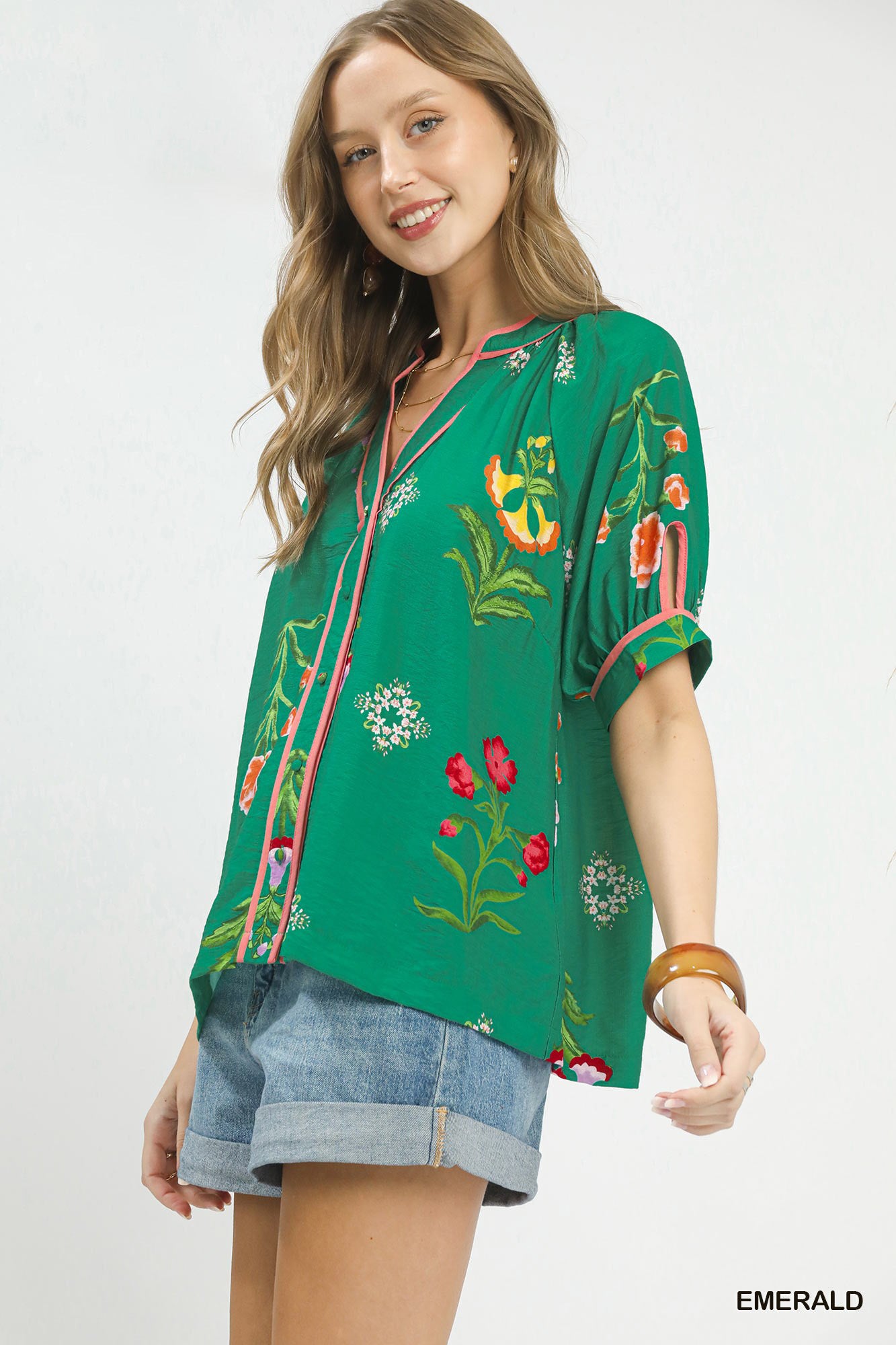 This Botanical Print Contrast Trim Button Blouse showcases a vibrant botanical floral print, accented with contrast blue trim along the neckline, placket and sleeves. It features a V‑notch collared neckline and short cuffed sleeves, with a button front design for easy wear. Unlined for a lightweight, breezy feel, it blends fresh botanical charm and refined contrast details into a versatile everyday blouse.