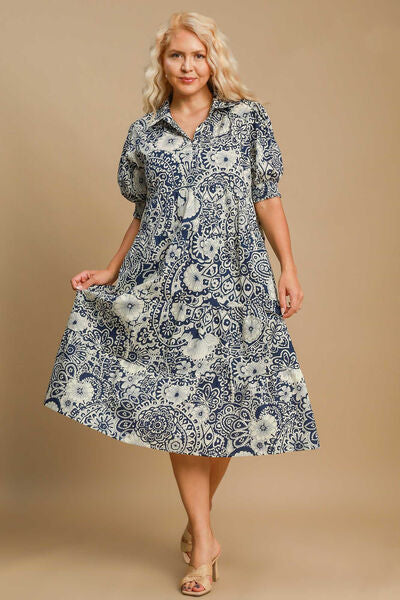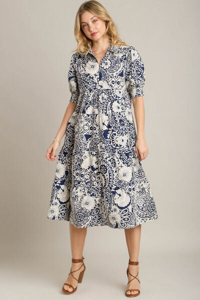 The Printed Smocked Cuff Puff Sleeve Midi Dress is a charming and stylish option for a variety of occasions. This dress features smocked cuffs with a delicate and feminine touch. The puff sleeves add a touch of drama. The midi length offers a flattering silhouette. The printed design adds a fun and playful element, making it a great choice for spring and summer events. Pair it with sandals or heels for a chic and trendy look.