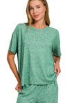 This stunning green sparkle loungewear set features a coordinated two-piece design perfect for comfort and style. Made from soft, stretchy fabric with an eye-catching metallic shimmer finish, this set includes a relaxed-fit short sleeve top and matching wide-leg palazzo pants. The luxurious sparkle texture adds glamour to casual wear while maintaining ultimate comfort. Ideal for lounging at home, casual outings, or as sleepwear. The fabric blend offers breathability and stretch for all-day comfort, while the sophisticated green color with metallic accents creates an elegant yet relaxed aesthetic.