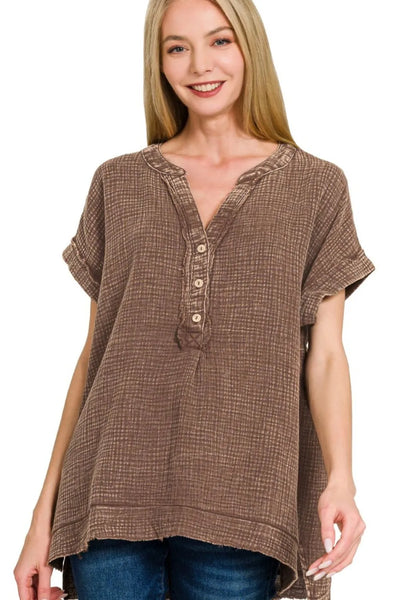 This stylish henley blouse features a comfortable relaxed fit crafted from lightweight textured gauze fabric in a versatile taupe shade. The short cuffed sleeves and decorative button placket create a casual yet polished look, while the high-low hemline adds modern appeal. Made from breathable cotton blend material, this blouse offers all-day comfort and easy care maintenance. Perfect for pairing with jeans, shorts, or skirts for effortless everyday style.